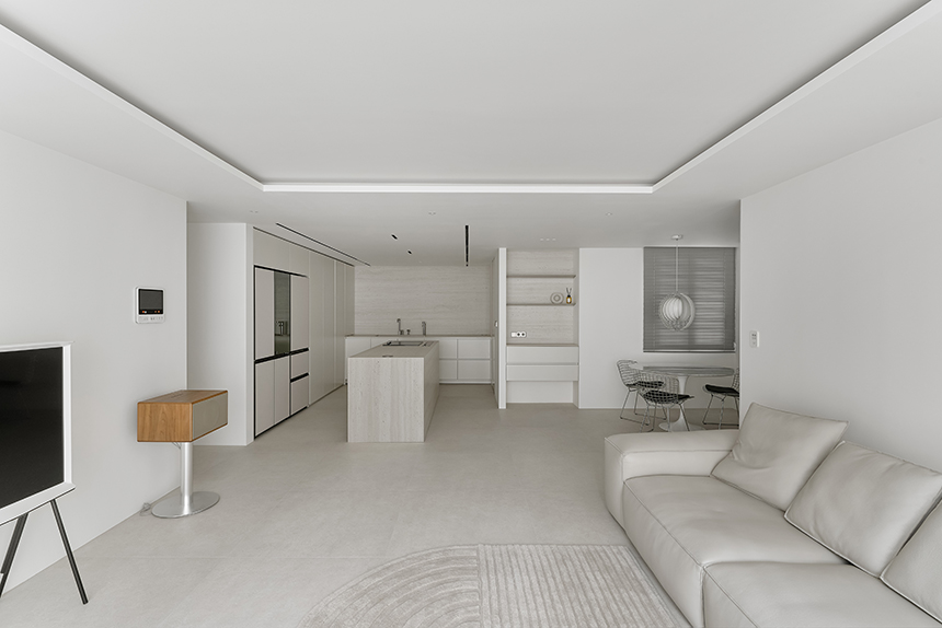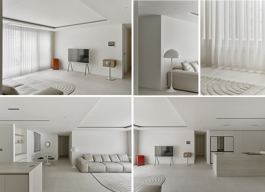 거실은 화이트와 베이지 톤이 조화롭게 어우러져 부드러운 온도를 느낄 수 있는 공간이다. 불필요한 장식을 배제하고 소재 본연의 질감을 그대로 살려 차분하고 담백하게 구성했다. 현관과 일관된 톤의 연속은 거실을 더욱 넓고 고요하게 느끼게 하며, 빛의 움직임에 따라 색감의 깊이가 달라져 시간의 흐름에 따라 다른 표정을 보여준다.