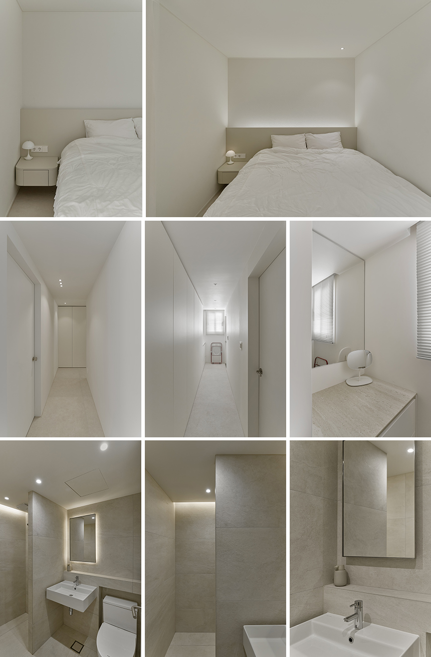 안방은 불필요한 요소를 과감하게 덜어내고 오롯이 ‘쉼’에 집중한 공간이다. 고객의 라이프스타일에 맞춰 불필요한 요소를 최소화하고, 드레스룸을 거실과 유기적으로 연결해 답답하지 않은 동선을 확보함으로써 더 많은 활용이 가능하도록 했다. 또한 기존의 안방 벽체를 철거해 최소한의 공간으로만 안방을 조성했다. 베이지 톤으로 제작한 침대 헤드가 따스하고 절제된 존재감으로 공간의 중심을 잡는다. 단순한 구조 속에서도 밀도 있는 여유가 느껴지는 휴식의 방이다.