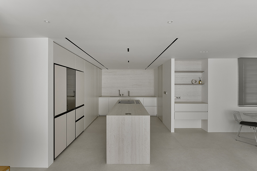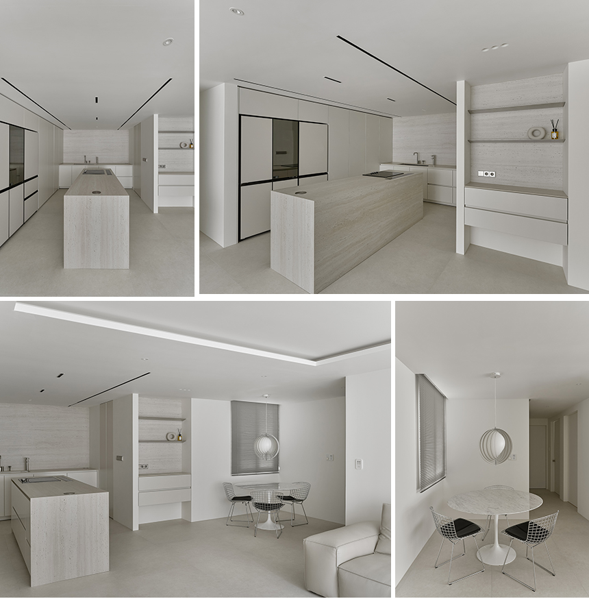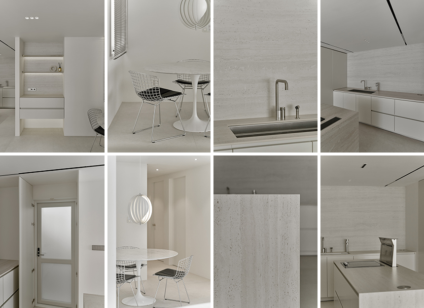 가장 눈에 띄는 변화는 주방의 확장이다. 기존의 협소했던 주방은 벽체를 조정해 확장하고, 동선을 단순화하면서 수납과 기능성을 높였다. 부드러운 미색 도장 도어와 트래버틴 세라믹 소재가 더해져 절제된 고급스러움을 완성한다. 기존 세탁실 터닝도어는 가구 도어 형태로 시공해 시각적 통일감을 주었으며, 사용하지 않던 작은 방을 철거해 다이닝룸으로 새로 구성했다. 덕분에 주방에서 다이닝으로 자연스레 이어지는 열린 생활공간이 탄생했다. 구조상 철거가 불가능했던 내력벽에는 금속선반으로 구성한 홈바 공간을 조성해 실용성과 감각적인 포인트를 더했다. 그 결과, 집의 중심이 거실에서 주방과 다이닝으로 확장되며 가족의 교류와 여유가 머무는 새로운 일상의 무대가 만들어졌다.