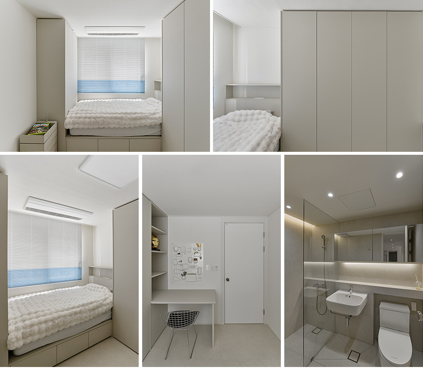 아이방은 작지만 다채로운 기능이 담긴 공간이다. 학습, 휴식, 놀이가 자연스럽게 이어지도록 구성했고, 충분한 수납공간으로 실용성을 확보했다. 전체를 베이지 톤으로 구성해 따뜻한 분위기를 유지하면서 블루 컬러의 블라인드로 경쾌한 포인트를 더했다. 공간의 크기와 상관없이 아이의 일상이 자연스럽게 스며드는 감성과 실용이 공존하는 방으로 완성되었다.