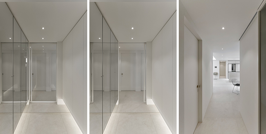 현관은 집의 첫인상을 결정짓는 시작점이다. 거울 도어로 제작한 신발장은 시각적 확장을 유도하며 개방감을 더했고, 현관에서 거실까지 이어지는 동일한 바닥 타일은 하나의 캔버스처럼 공간을 자연스럽게 연결시킨다. 톤과 질감의 일관성이 더해져 집 안으로 들어서는 순간 부드럽고 안정된 분위기가 스며든다.