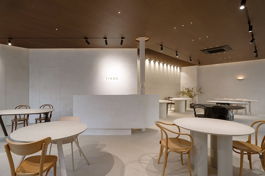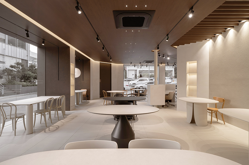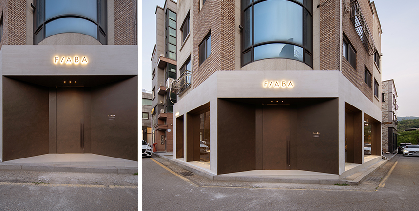 내부에 들어서면 사선으로 기울어진 파사드 라인과 평행을 이루도록 카운터가 배치되어 있다. 이 구조적 연계는 쇼룸에 들어서는 순간 가장 먼저 마주하는 공간의 중심이 된다. 또한 피아바 가구의 정교한 디테일을 기둥 디자인에 반영해 브랜드의 정체성을 담아냈다.