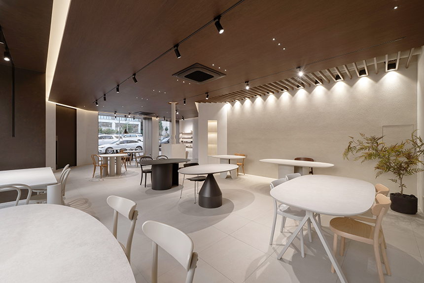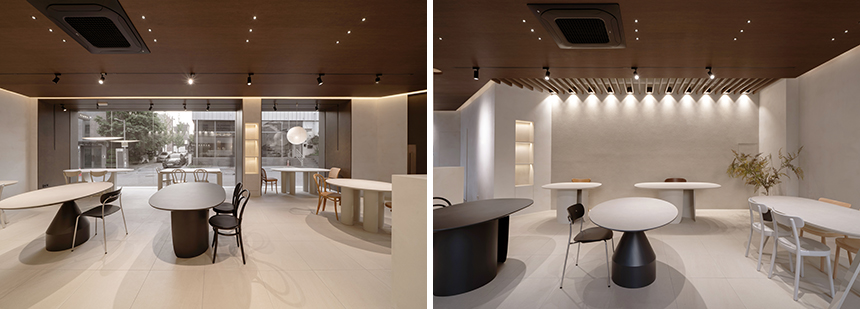 벽면은 쇼윈도를 마주하는 방향으로 자리해 확연한 빛의 대비와 질감이 깊이감 있는 공간감을 만든다. 천장의 우드 루버를 통해 확산된 빛은 거친 스타코 벽면에 스며들어 내외부의 시각적 경계를 완화한다. 우드 인테리어 필름으로 마감한 천장에는 간접조명을 조성해 따뜻하고 포근한 분위기를 연출하며, 낮은 천장고를 시각적으로 확장시키는 역할을 한다.
