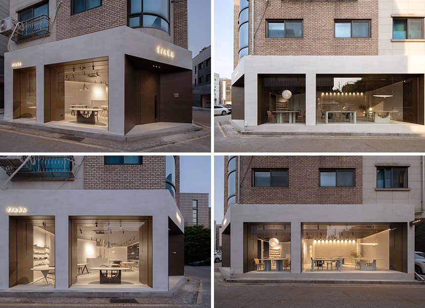 30평 남짓의 쇼룸은 규모 자체는 크지 않지만, 공간의 입구부터 방문객의 시선을 사로잡는다. 설계팀은 한정된 공간 안에서 강렬한 첫인상을 주고자 3m에 달하는 도어를 설치하며 깊이 있는 컬러와 질감을 더해 입구를 하나의 매스로 인식시키고자 했다. 측면의 유리창 프레임 또한 기존 건물 기둥과 연결되어 자연스럽게 하나의 조형물로 해석된다. 넓게 펼쳐진 파사드 쇼윈도는 낮에는 채광을 극대화해 자연스러운 공간 분위기를 자아내고, 밤이 되면 공간 내부의 빛이 은은하게 퍼져 나가며 가구와 브랜드의 존재감을 더욱 부각시킨다.