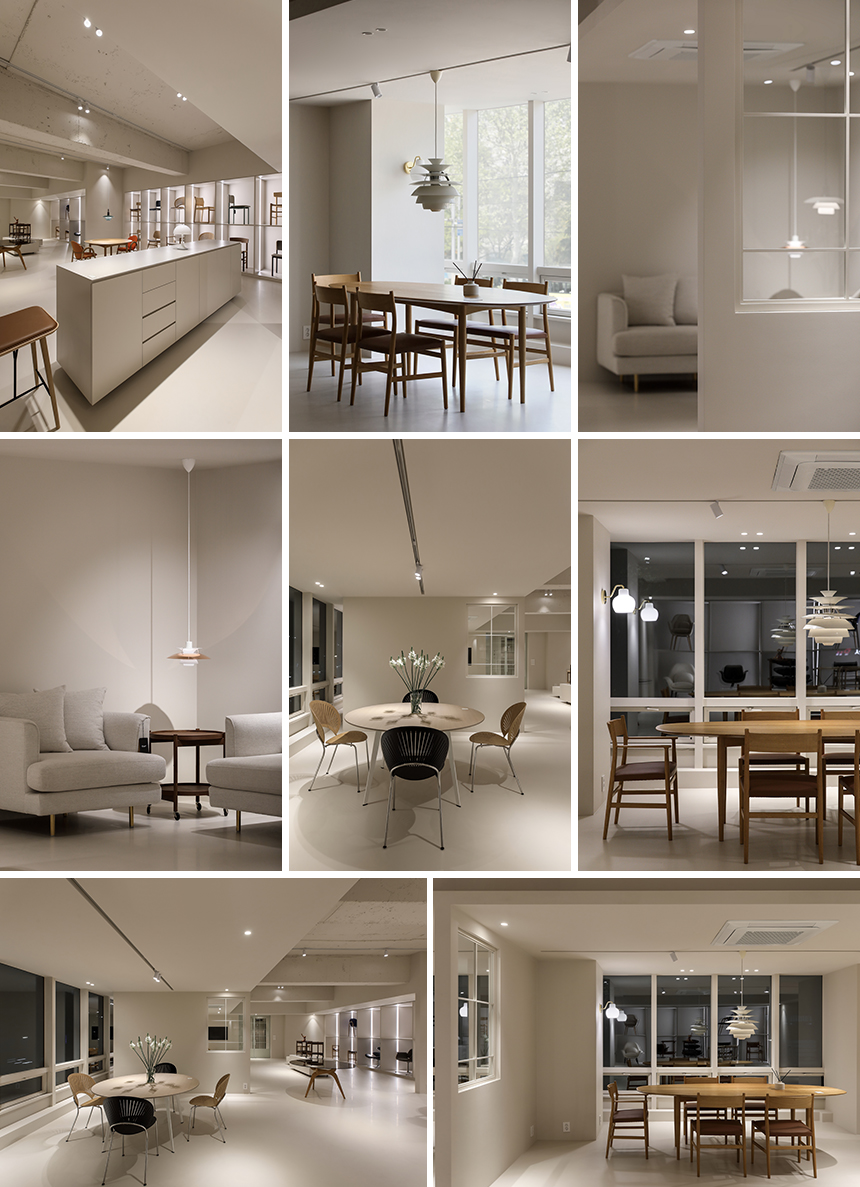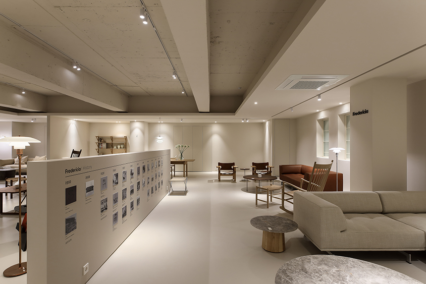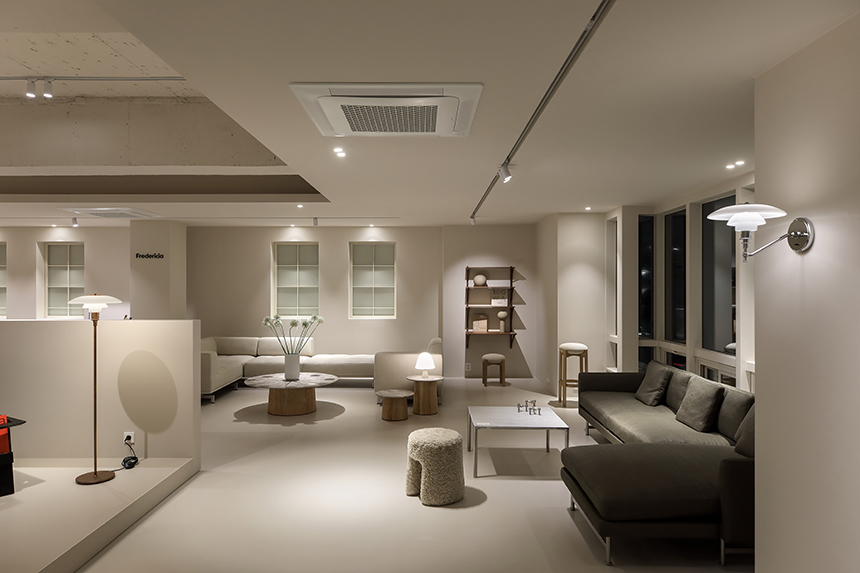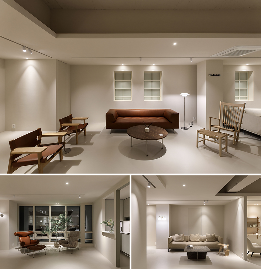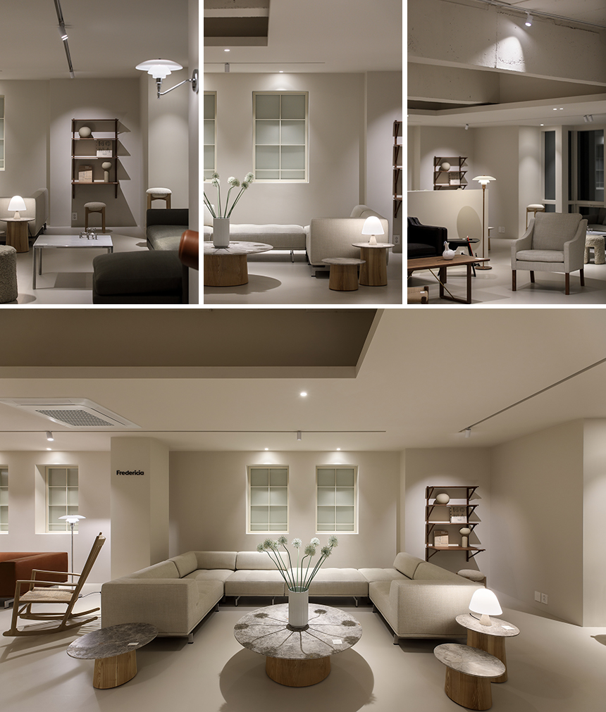 새로 확장한 2층과 3층은 세계적으로 명망 높은 덴마크 가구 브랜드 ‘프레데리시아(Fredericia)’의 국내 런칭을 위한 새로운 공간이다. 클라이언트는 프레데리시아가 지닌 정제된 가치와 덴마크 디자이너들의 이야기를 진심을 담아 전했고, 그 철학과 미감을 온전히 드러낼 수 있는 전시 공간을 Interior오월이 맡게 되었다. 새로운 전시장은 복잡하지 않은 동선으로 관람객이 자연스럽게 가구에 다가서도록 이끌며, 편안한 체험과 감각적인 휴식을 동시에 선사한다. 차분한 톤의 공간에 놓인 프레데리시아 체어와 테이블은 군더더기 없는 선으로 절제된 아름다움을 드러내고 심플한 진열 방식 속에서도 각각의 디자인이 가진 개성과 따뜻한 질감이 공간에 온기를 더한다.