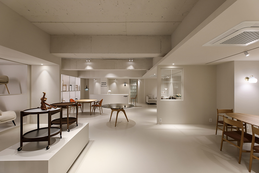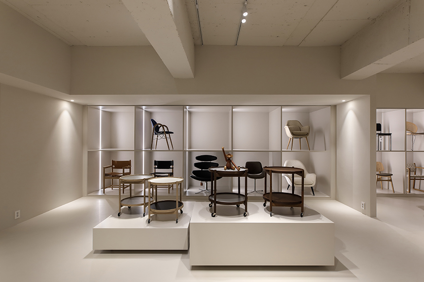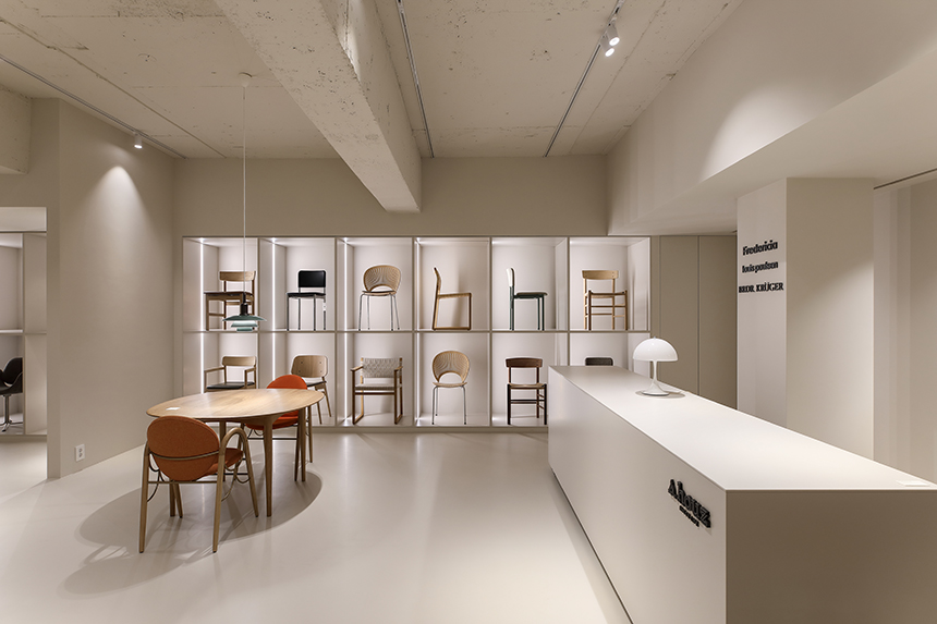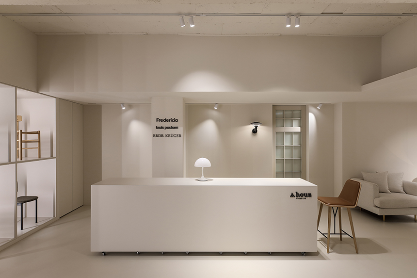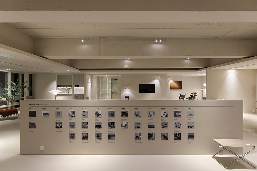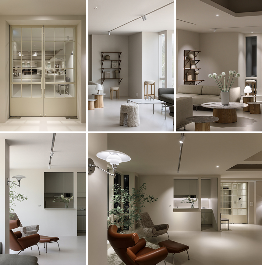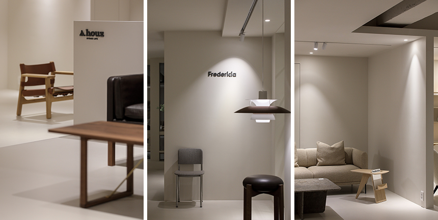 새로 확장한 2층과 3층은 세계적으로 명망 높은 덴마크 가구 브랜드 ‘프레데리시아(Fredericia)’의 국내 런칭을 위한 새로운 공간이다. 클라이언트는 프레데리시아가 지닌 정제된 가치와 덴마크 디자이너들의 이야기를 진심을 담아 전했고, 그 철학과 미감을 온전히 드러낼 수 있는 전시 공간을 Interior오월이 맡게 되었다. 새로운 전시장은 복잡하지 않은 동선으로 관람객이 자연스럽게 가구에 다가서도록 이끌며, 편안한 체험과 감각적인 휴식을 동시에 선사한다. 차분한 톤의 공간에 놓인 프레데리시아 체어와 테이블은 군더더기 없는 선으로 절제된 아름다움을 드러내고 심플한 진열 방식 속에서도 각각의 디자인이 가진 개성과 따뜻한 질감이 공간에 온기를 더한다.