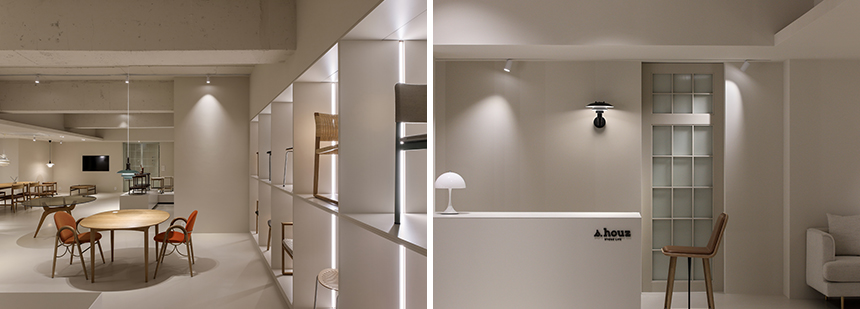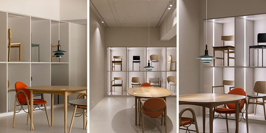 오른편 ‘브라더크루거 테이블과 루이스폴센 존’은 브라더크루거 테이블과 함께 체어에 앉아볼 수 있도록 구성했다. 큰 창을 통해 들어오는 자연광이 부드러운 분위기를 더해주며, 가구의 소재와 색감을 한층 더 돋보이게 한다. 이곳은 고객이 실제 생활 속에서의 사용감을 체험할 수 있는 특별한 코너다.