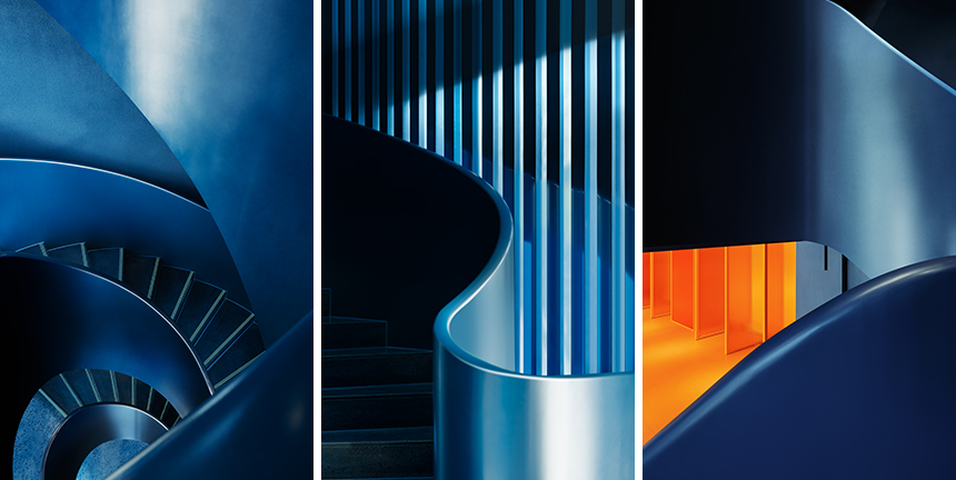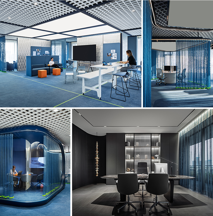 쇼 오피스는 ‘에너지의 집합’라는 주제를 다섯 개 층에 걸쳐 풀어냈다. 1층의 리셉션 데스크는 곡선 미학을 살린 유동적 디자인으로 방문객을 맞이하며, 천장 컷아웃을 통해 상층부가 시각적으로 연결된다. 깊은 파란색을 입힌 조형 계단은 각 층을 자연스럽게 이어주며, 직원 간 우연한 만남과 활발한 이동을 유도한다. 입구의 원형 디스플레이 공간은 최신 주력 제품을 선보이고, 인터랙티브 스크린에서 기업의 비전과 혁신 역사를 생생하게 전달한다.