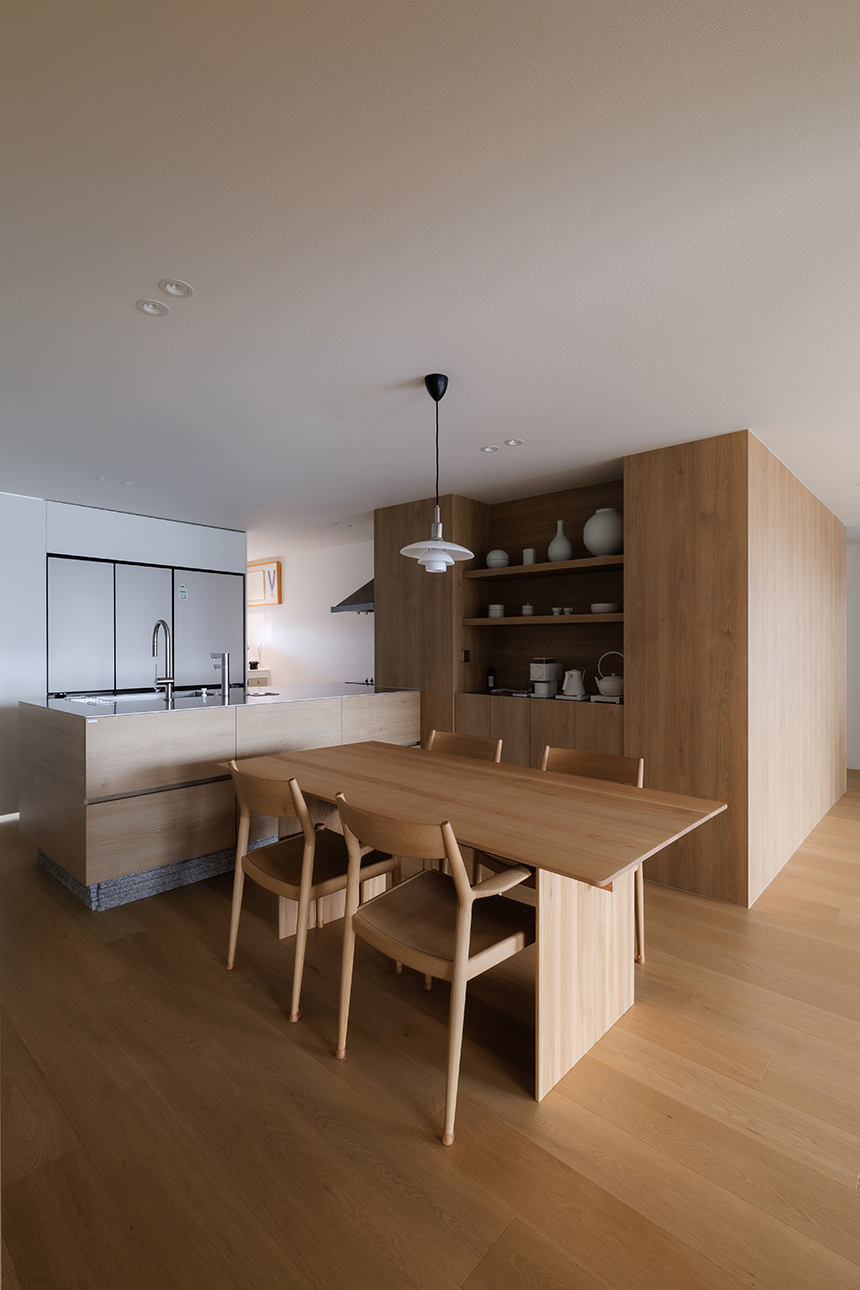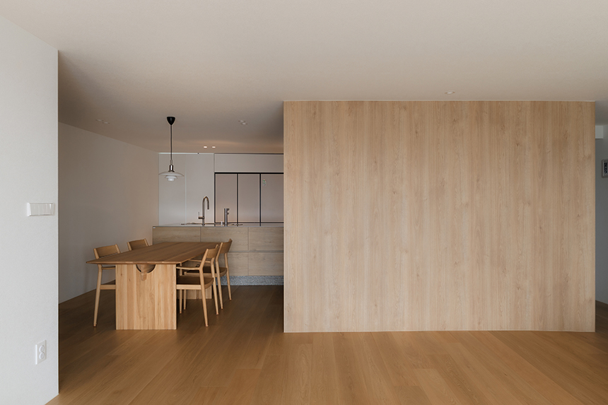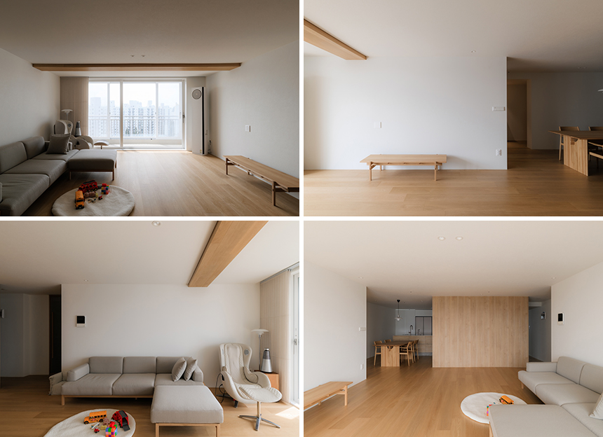 공용부의 중심 벽면은 우드 마감으로 마무리해 시선을 자연스럽게 모으고 공간 전체에 따뜻한 온기를 더했다. 별도의 확장 없이도 구조적 개방감을 확보해 거실과 주방이 유기적으로 이어지며, 단정한 리듬을 형성한다. 일반적으로 3W 형태의 창호를 적용하지만, 2W로 단순화해 시야의 중심을 넓혔다. 창을 통해 들어오는 자연광이 실내 전반을 은은하게 감싸며, 시간대에 따라 다채로운 표정을 만든다.