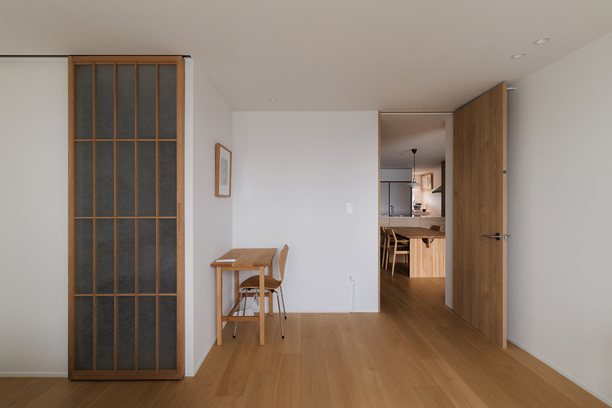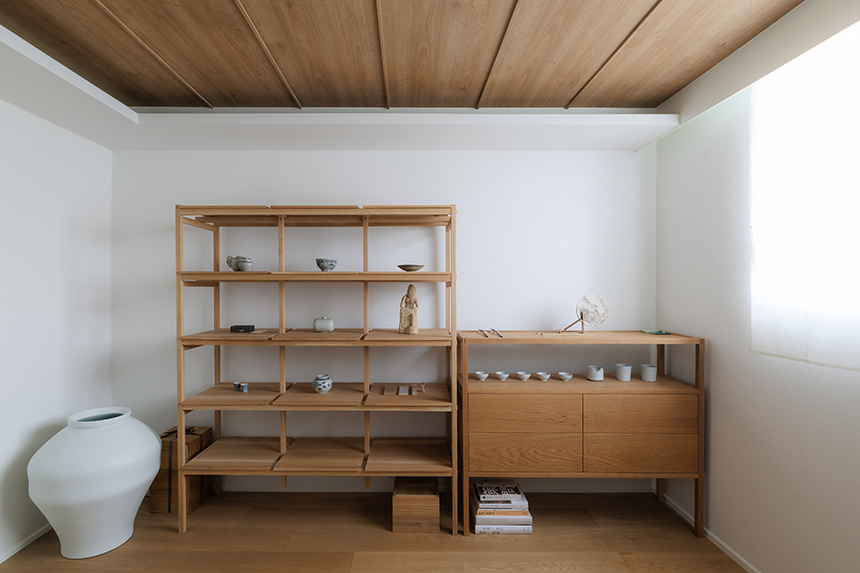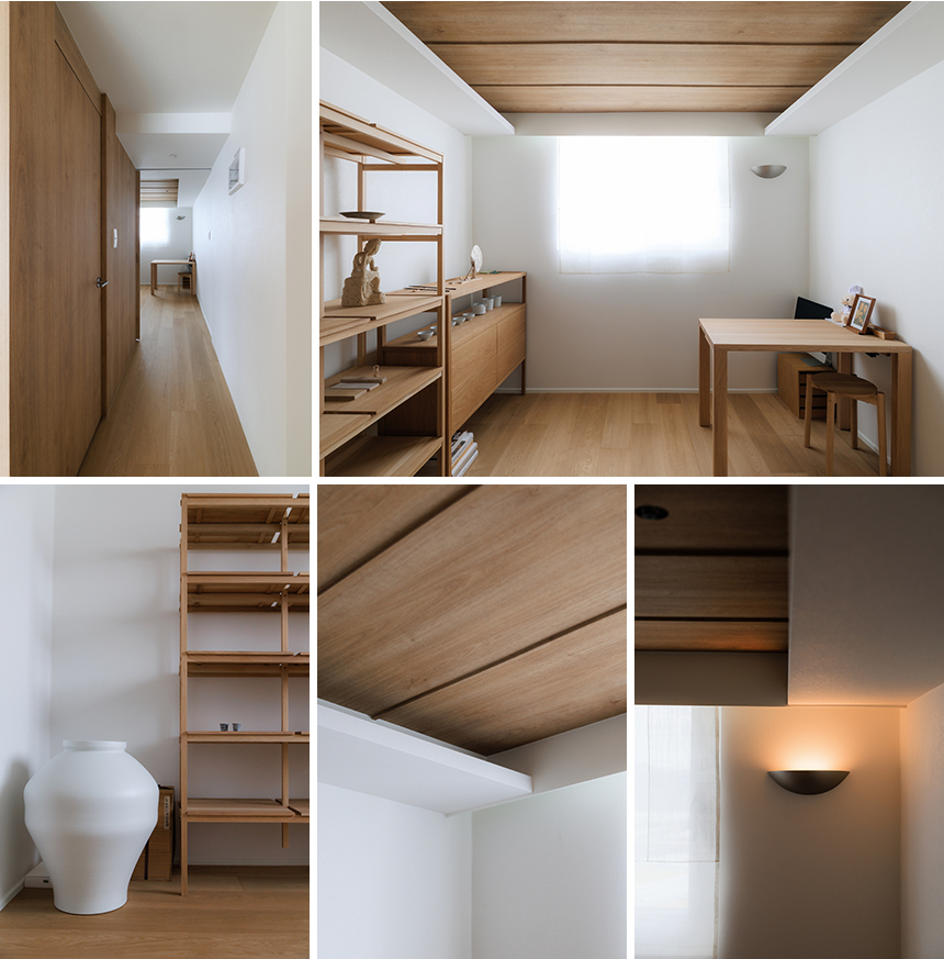 확장형 구조의 작은 방은 붙박이장을 철거해 여유로운 서재로 구성했다. 슬라이딩 도어를 적용해 개방감과 안전성을 모두 확보했고, 천장은 칸살 디테일이 더해진 우물천장 구조를 적용해 한옥의 미감을 감성적으로 풀어냈다. 시선을 위로 끌어올리는 천장 선은 공간의 깊이를 만들며, 차분히 집중할 수 있는 안정된 분위기를 형성한다.
