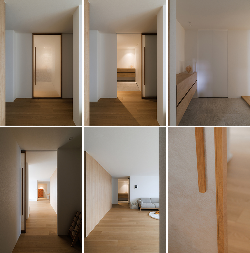 현관은 가족의 생활 동선에 맞춰 재구성했다. 비내력벽을 이동해 팬트리 수납공간을 확보하고, 유모차와 외출 용품을 정리할 수 있도록 했다. 바닥의 격자무늬 타일은 시각적으로 깊이감을 주며, 은은한 조명은 여백과 그림자를 드러내도록 계획했다.