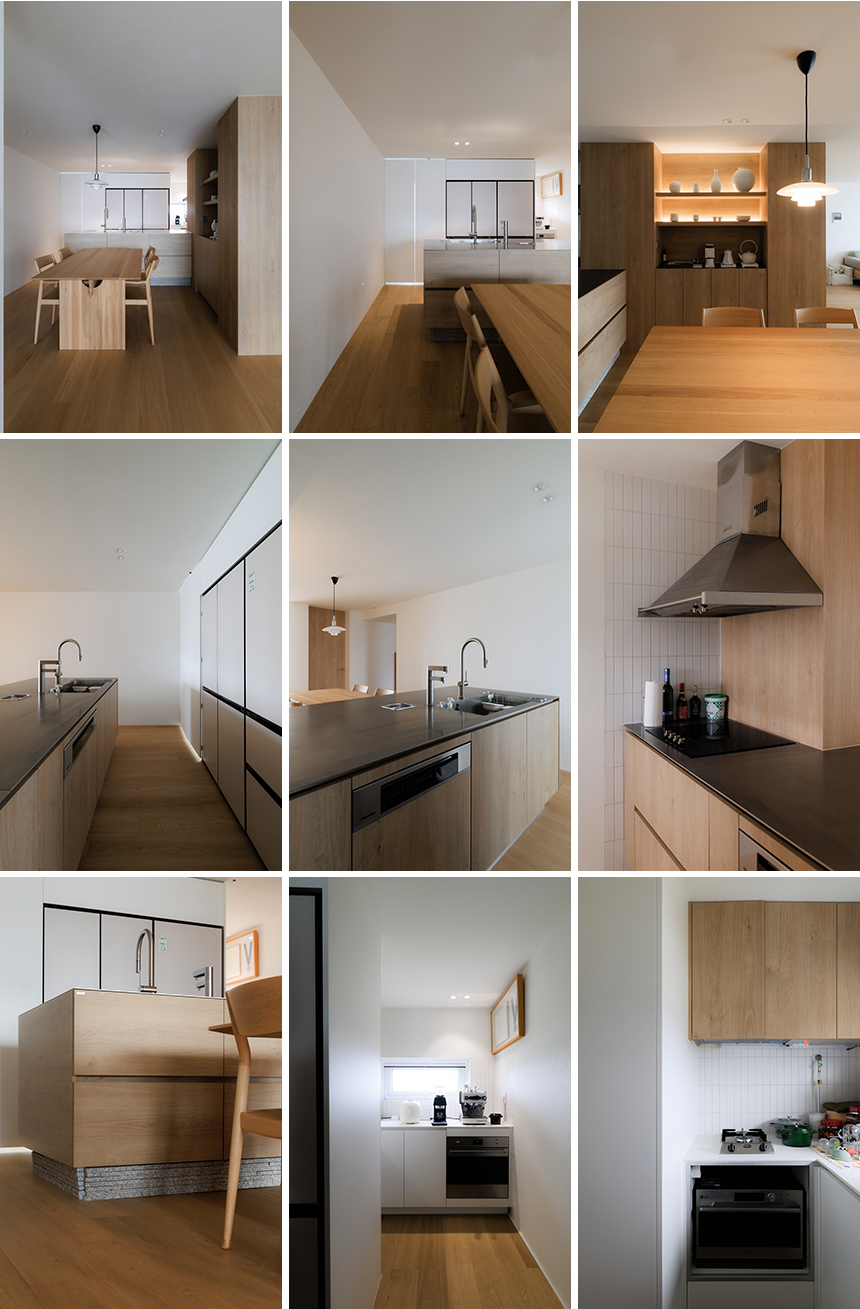 주방은 기존 ㄷ자형 구조를 대면형 아일랜드로 변경해 공간의 중심을 식탁으로 옮겼다. 중문을 철거하고 시야를 개방하면서 거실과 주방이 하나의 장면처럼 연결된다. 요리와 식사가 자연스럽게 이루어지는 구조로 가족이 머무는 시간이 곧 공간의 중심이 된다. 또한 클라이언트가 요리와 커피를 즐기는 라이프스타일을 갖고 있어 후드, 쿡탑, 오븐, 식기세척기 등 다양한 가전이 조화롭게 배치해 기능성과 미감을 모두 충족시켰다. 아일랜드 상판은 스테인리스 스틸 소재로 마감해 위생적이면서도 절제된 아름다움을 완성했다. 관리가 까다로운 소재로 알려져 있지만, 실제 사용 후 클라이언트의 평가처럼 ‘더 쾌적하고 위생적’이라는 경험은 사용자의 생활 방식이 재료의 가치를 결정한다는 점을 보여준다. 아일랜드 하부에는 커팅한 사비석을 적용해 매스감에 리듬을 주고, 바닥과의 경계를 안정감 있게 묶었다. 이 작은 디테일은 한옥의 재료미를 현대적으로 해석한 상징적 요소다. 주방 옆 보조공간은 냉장고장을 기준으로 자연스럽게 분리되며, 홈카페와 조리 공간의 기능을 동시에 수행한다. 채광이 풍부하게 들어와 작은 면적임에도 아늑한 분위기를 만든다.