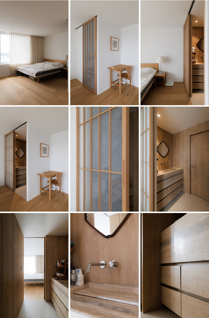 안방은 여백과 비례감에 집중해 차분하고 안정된 분위기를 조성했다. 도어 높이를 상향 조정해 개방감을 극대화했으며, 하이엔드 공간에서 볼 수 있는 우아한 비례감을 살렸다. 그 결과 침실 전체가 한층 넓고 정돈된 인상을 준다. 작은 면적의 안방 욕실은 세면대를 외부로 분리해 파우더존을 확장했다. 실버 트래버틴 천연석으로 제작된 세면대는 깊이감 있는 질감으로 공간에 무게감을 부여한다. 하부에는 콘센트를 숨겨 깔끔한 사용성을 갖췄으며, 욕실과 파우더존은 모두 동일한 타일로 마감해 시각적 통일감을 유지했다. 칸살 중문은 공간의 포인트이자 냄새 차단 기능도 더해 실용성과 디자인을 조화시켰다.