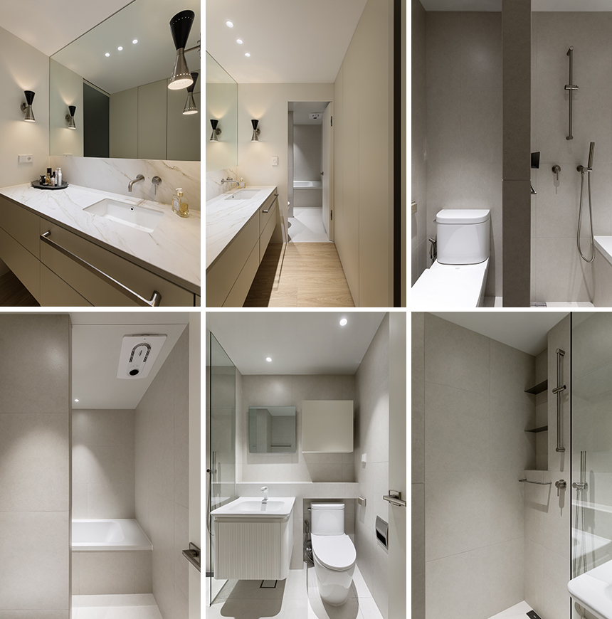욕실은 기존의 세면대를 과감히 제거하고 입구 쪽에 파우더룸을 별도로 분리해 넓은 거울과 심플한 조명으로 공간을 확장시켰다. 벽면에 있는 전기분전함은 히든도어 방식으로 마감해 군더더기 없이 깨끗한 벽을 구성했고, 안방 욕실과 거실 욕실 모두 밝고 편안한 톤의 포셀린 타일을 시공해 통일된 느낌을 주었다. 타일과 마감재는 동일 소재로 이어져 심플한 디자인의 연속성을 강조함과 동시에 실사용자의 편의도 극대화했다.