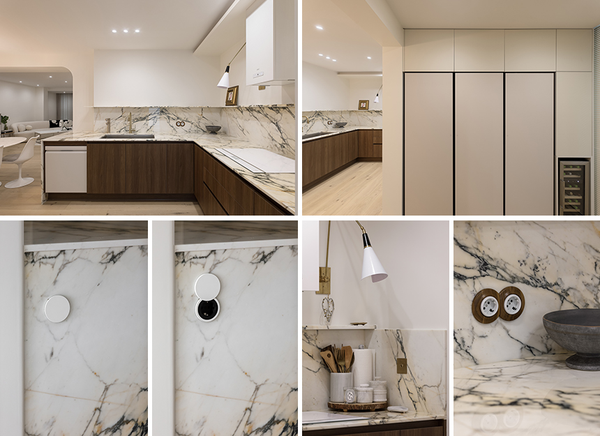 주방은 클라이언트의 뛰어난 요리 실력에 걸맞게 외국의 고급 레스토랑을 연상시키는 이국적인 아이템으로 완성되었다. 주방 상판과 벽면에는 칼라카타 파오나찌 대리석으로 마감해 우아한 질감이 드러나며 전체적인 분위기는 따뜻한 원목 하부장과 부드러운 베이지 톤의 공간이 조화를 이룬다. 세부적인 악센트는 해외에서 직구한 관절형 벽등과 체코 브랜드 카티 패티(Katy Paty) 콘센트, 코스턴(Corston) 황동 스위치와 같은 유니크한 아이템들이 완성도를 끌어올린다. 도자기 소재의 카티 패티 콘센트는 곡선과 컬러감으로 공간에 정확한 포인트를 주며, 코스턴의 황동 스위치는 디테일에서 높은 내구성과 감성을 보여준다. 여기에 스토프 나겔(Stoff Nagel) 캔들홀더와 클래식한 플레이트, 디자인 오브제와 테이블웨어를 함께 진열해 실용성과 미감을 동시에 만족시키는 공간으로 꾸며졌다.