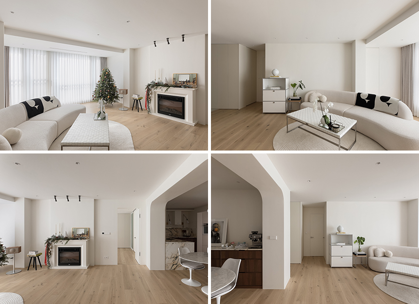 거실은 연한 크림 베이지 계열의 벽면과 따뜻한 누드 오크톤 마루를 조화롭게 배치해 안정감과 부드러운 온기가 전해지는 공간으로 완성됐다. 전반적인 색감은 낮은 채도로 통일해 다양한 소재와 가구의 질감이 자연스럽게 드러나도록 설계했다. 철거가 불가능한 내력 벽체와 기둥들은 단순 구조적 요소에 그치지 않고, 공간을 채우는 조형미로 승화되어 입체적이고 리듬감 있는 분위기를 만든다.