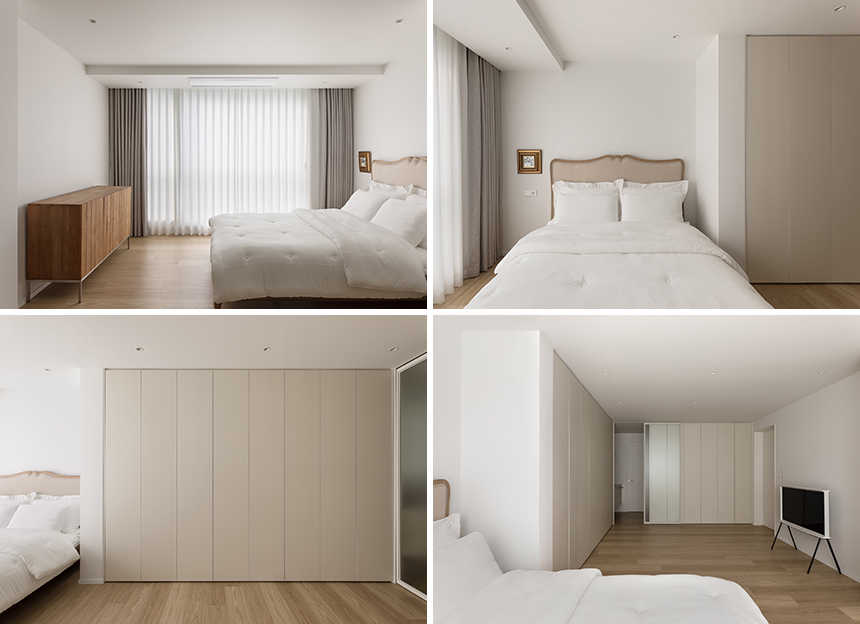 안방은 최대한 옷을 수납할 수 있는 붙박이장을 확보하고 계절 옷부터 다양한 생활소품까지 깔끔하게 보관할 수 있도록 설계됐으며, 파우더룸과 욕실을 연결하는 입구에는 미닫이문을 적용해 일상 동선을 실용적으로 분리했다. 넓게 확장한 발코니는 침대 공간의 활용도를 높여 호텔 객실처럼 쾌적하고 넉넉한 침실로 완성되었다. 가구는 세덱(Sedec) 사이드보드와 포터리 반(Pottery Barn) 침대를 선택해 미니멀한 베이스에 따뜻한 목재의 분위기를 더했다. 침대 헤드 옆에는 클라이언트가 애정하는 일러스트 작가의 그림으로 포인트를 주는 골드 빈티지 액자가 놓여 잠깐의 시선에도 공간의 성격이 뚜렷하게 드러난다.