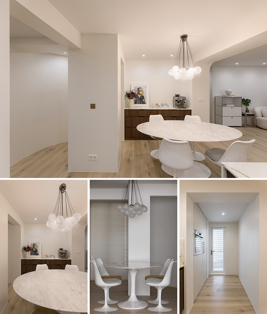다이닝 공간은 구형 펜던트 조명과 우드 소재의 오벌 테이블, 화이트 톤의 의자가 깔끔하게 배열되어 따뜻하고 밝은 분위기를 완성한다. 벽면 진열장과 세라믹 소재의 카운터에는 클라이언트가 직접 고른 아트 오브제가 자리해 개성을 더한다. 다이닝 공간은 직선 벽면과 곡선 벽체가 만나는 지점에서 시각적인 균형감과 공간의 즐거움을 선사한다. 다이닝 공간은 구형으로 이루어진 펜던트 조명이 식탁 위를 감싸고, 식탁과 의자, 수납장까지 모두 따스하고 은은한 빛 속에 놓인다.