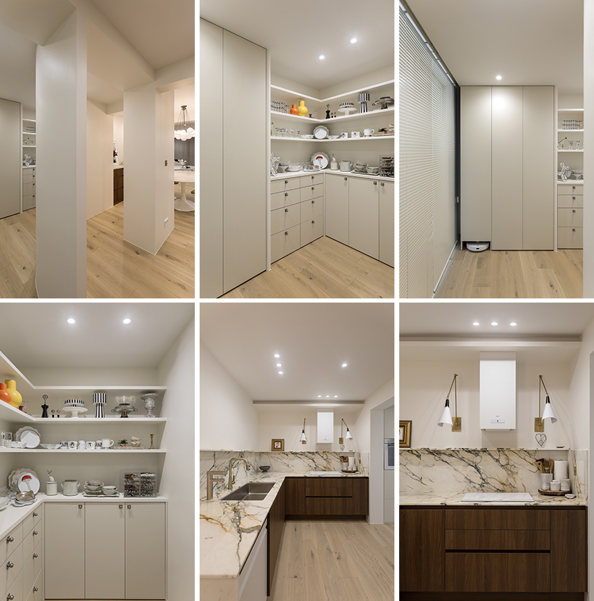 좁았던 주방 공간을 확장하며 가전제품의 공간과 충분한 수납장을 확보했다. 상부 수납장은 배제하고 키 큰 장과 하부장의 배치를 통해 가전제품과 다양한 조리도구, 식기류의 수납과 동선이 한층 효율적으로 개선됐다. 특히, 곡선 형태의 짧은 복도 끝에 오픈형 팬트리룸을 마련하여 자주 사용하는 그릇, 유리잔, 테이블웨어를 진열하고 빠르게 접근할 수 있도록 구성했다. 팬트리 내부의 오픈 선반과 낮은 서랍장에는 포인트가 되는 주방 소품과 오브제들이 컬러와 형태별로 정갈하게 분류되어 인테리어의 기능적 역할과 장식적인 효과를 동시에 달성한다.