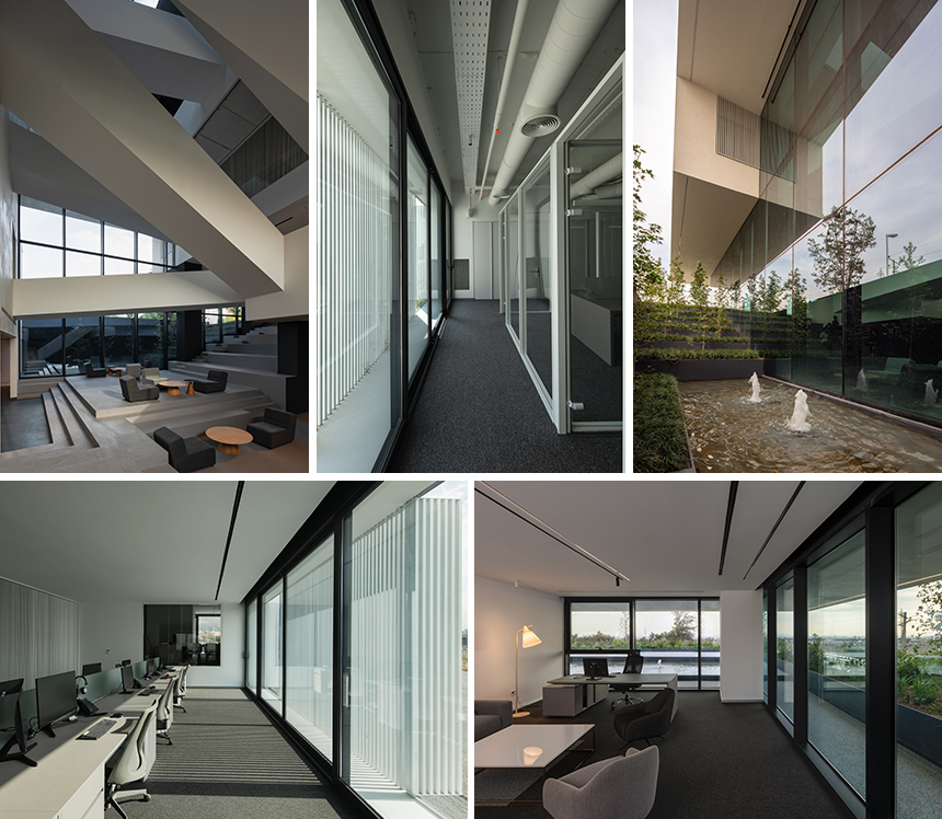 지상층에는 상부 공간에서 시야가 트이는 덮개가 있는 플랫폼이 ‘활동 무대’ 역할을 하며 그 주변으로는 카페테리아, 게임 존, 체육 시설 등 다양한 서비스 및 여가 공간이 조성되어 있다. 공간들은 지하에 위치한 원형 극장과 연결돼 경험의 순환 구조를 형성, 사용자들이 동선이나 휴게 공간 어디에서건 지속적으로 움직임과 활동을 관찰하고 참여할 수 있다. 미끄러진 볼륨, 계단식 테라스, 투명한 다리, 복합적인 동선이 긴밀하게 어우러져 시각적 연결성을 극대화하고 우연한 만남과 협업의 가능성을 증진해 정적인 사무실을 생명력 넘치는 협력적 유기체로 탈바꿈시켰다.