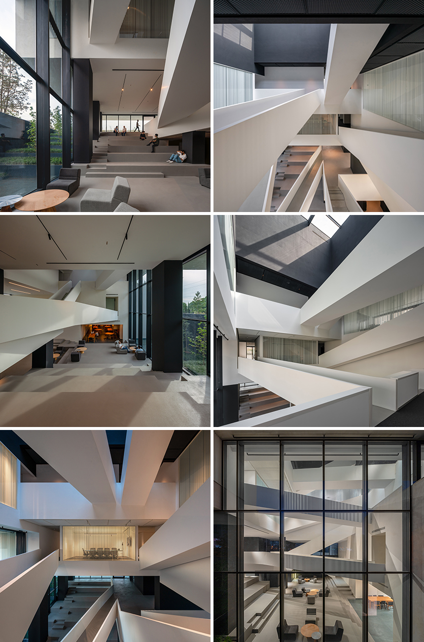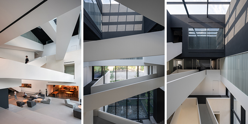 전체 부지의 50%를 차지하는 대형 매스를 시작으로 3층 높이의 직육면체 세 블록이 위아래로 쌓인 형태로 출발했다. 이 세 개의 블록은 남북의 축 방향으로 미묘하게 미끄러지고 이동하면서 여러 층에 걸쳐 테라스와 반개방 공간을 형성한다. 이러한 공간들은 시각적인 휴식처이자 독립적인 집단 교류의 장으로 기능하며 층별로 다양하게 배치됐다. 중앙에는 수직으로 아트리움이 관통해 공간의 투명성과 시각적 연속성을 높이고, 블록을 관리용과 공용 구역으로 명확히 구분하는 동시에 계단과 연결 다리를 배치해 사용자의 동선을 유연하게 만들고 활발한 소통과 시각적 연결을 장려했다.