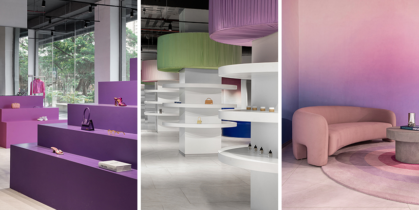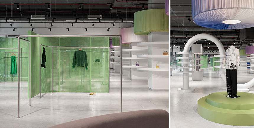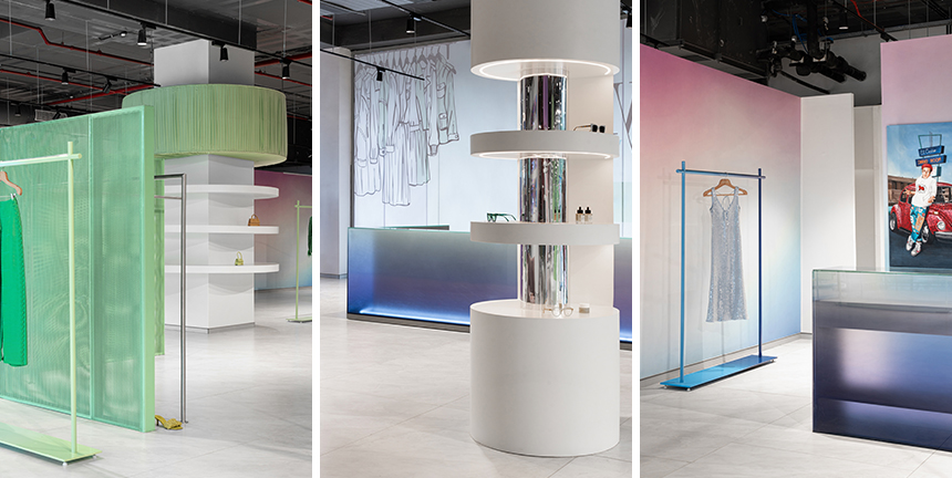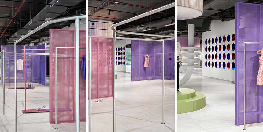 특히 맞춤 제작된 가구와 진열대는 공간 경험의 핵심 축이다. 여성복 섹션은 핑크와 퍼플이 부드럽게 그러데이션 되는 옴브레 효과(Racks Ombré)를 입힌 진열대를, 남성복 섹션은 블루와 그린 톤을 적용해 색채 자체로 영역을 상징화했다. 곡선형 금속 펀칭 스크린은 브랜드별 공간을 은은히 구획하면서도 시각적 연속성을 유지해 투명성과 분절의 절묘한 균형을 보여준다. 그 결과 각 브랜드의 정체성이 살아나면서도 복합적인 쇼핑 경험이 유기적으로 완성되었다.