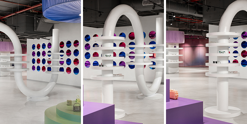 매장의 중심부에는 이중 유리 박스로 제작된 캐셔 테이블이 배치되었다. 내부에서 번지는 은은한 조명이 미래적인 부유감을 만들어내며, 공간의 중심을 상징적으로 강조한다. 또한 산제이 푸리 아키텍츠는 공간 속 곳곳에 ‘장난기 어린 포토존’을 설치했다. 뱀처럼 유려하게 뻗은 선글라스 디스플레이는 방문객이 자유롭게 오가며 제품과 공간의 경계를 흐리게 만들고, 원형의 독립형 화장품 진열대는 내부 조명을 통해 제품을 보석처럼 빛내며 극적인 순간을 연출한다.