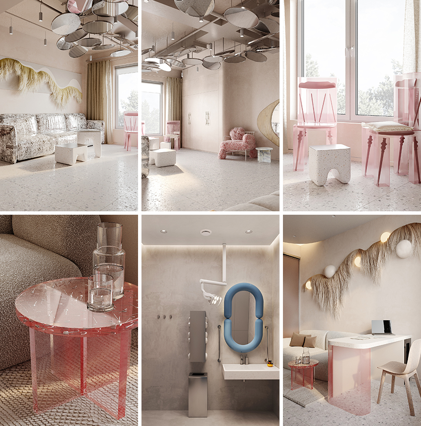 리셉션 공간은 클리닉의 철학을 집약적으로 보여주는 곳이다. 투명한 아크릴 소재로 제작된 카운터가 중심에 놓여 있고, 어린이 환자를 위한 낮은 테이블은 재활용 플라스틱으로 만들어졌다. 그 뒤로는 세라믹 크라운의 형태에서 영감을 얻은 볼록한 장식이 시선을 잡는다. 벽면 장식은 섬유를 혼합해 제작한 재활용 플라스틱 타원형 패널로 칫솔을 연상시키며 치과 본연의 청결함과 관리의 상징적 의미를 공간적으로 표현했다.