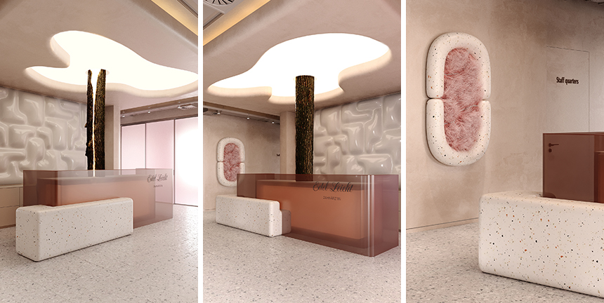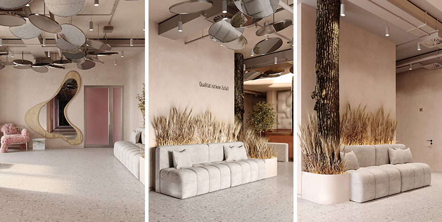 대기 공간은 콘셉트와 생태적 감각을 그대로 확장한 곳이다. 치과용 구강 거울에서 영감을 받은 장식 패널을 사용해 보는 즉시 이곳의 정체성을 직관적으로 전달한다. 모든 가구는 재활용 소재거나 기존 가구를 새롭게 재해석해 제작했다. 인테리어 곳곳에 삽입된 밀 이삭과 말린 갈대 장식은 자연과의 관계를 상징하며, 클리닉의 친환경적인 방향성을 한층 강화한다. 주문 제작된 가구 중에는 재활용 플라스틱과 치과용 회전형 절삭 기구 버(Bur)를 넣어 제작한 투명 테이블, 빈티지 가구 부품을 아크릴로 봉합해 만든 의자 등이 있다.